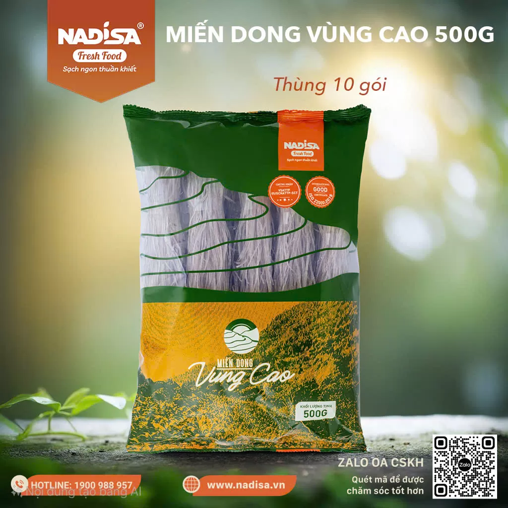Miến dong vùng cao sợi dẹt là một sản phẩm nổi bật của Nadisa, với nguyên liệu 100% bột dong riềng,được sản xuất trên hệ thống dây chuyền hiện đại, sử dụng nguồn nước lọc RO đảm bảo vệ sinh an toàn thực phẩm.