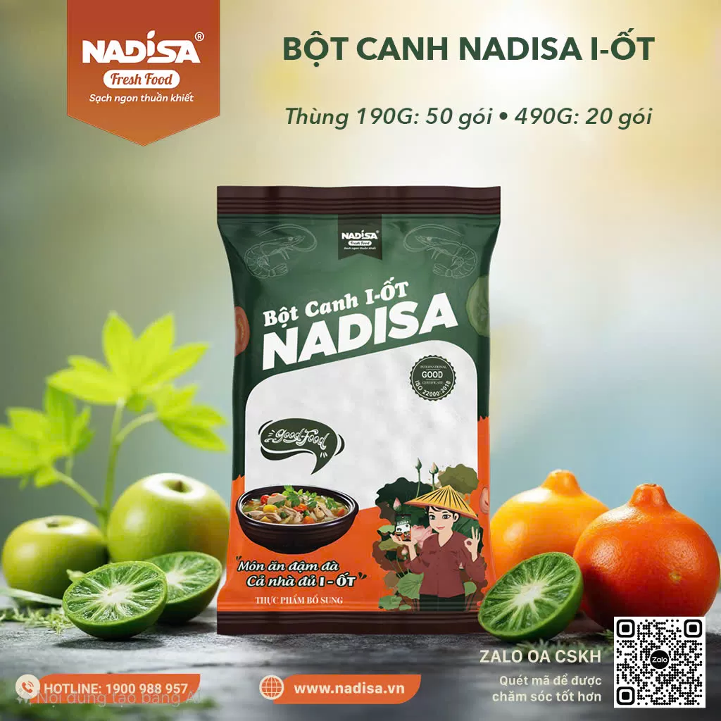 Bột canh i - ốt Nadisa có thành phần chính gồm: muối i - ốt, đường, bột tỏi, bột tiêu, hành lá, giúp món ăn của bạn trở nên hấp dẫn hơn.