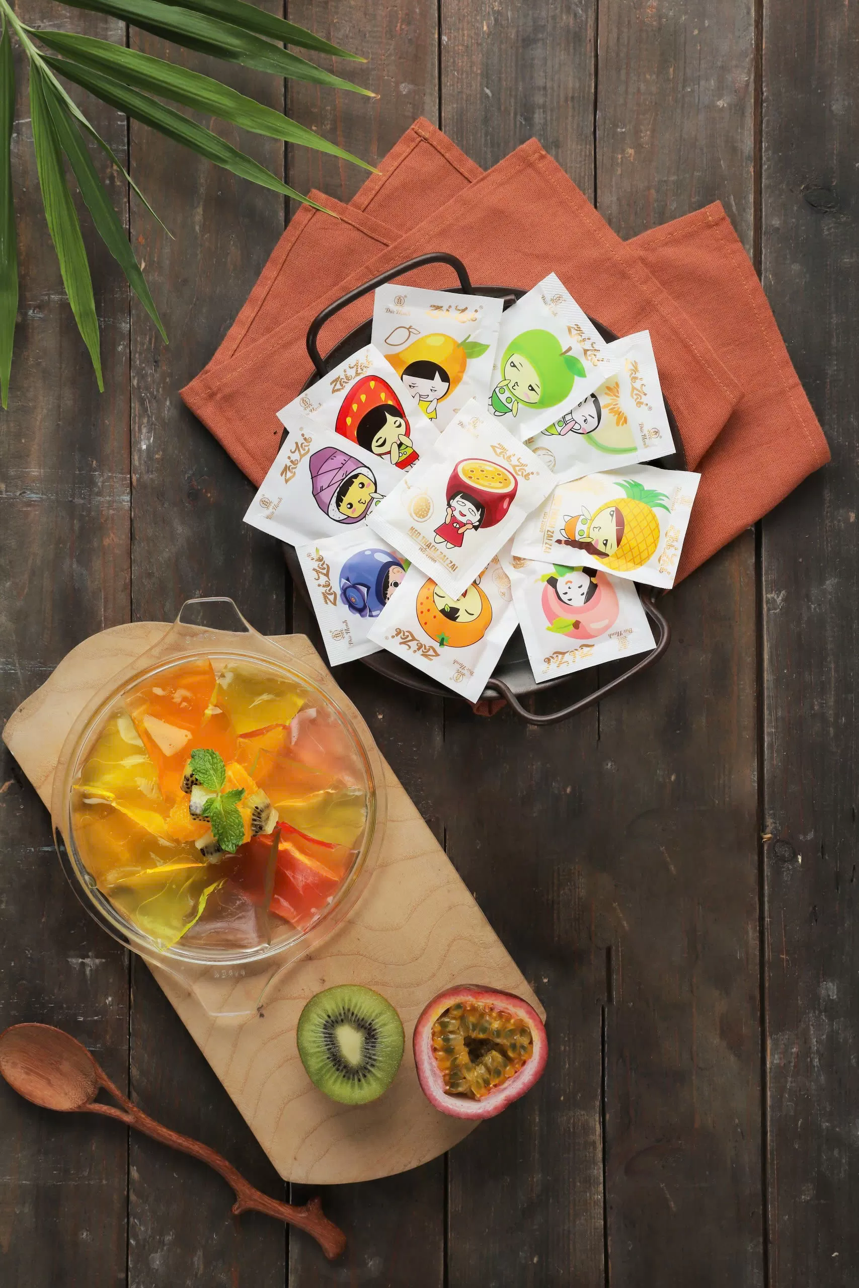 Nước, đường kính, bột làm thạch, chất làm dày, chất điều chỉnh độ axit, chất tạo ngọt tổng hợp, chất bảo quản, hương thực phẩm tổng hợp (hương đào, hương việt quất, hương chanh leo, hương dưa, hương nho, hương me, hương dứa, hương táo, hương khoai môn, hương dâu, hương xoài, hương vani), màu thực phẩm tổng hợp...